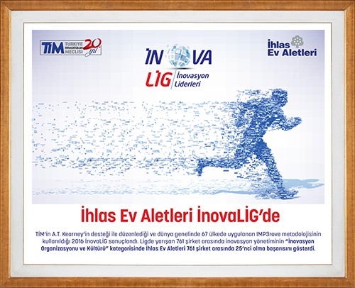 TİM’in A.T. Kearney’in desteği ile düzenlenen ve dünya genelinde 67 ülkede uygulanan IMP3rove metodolojisinin kullanıldığı 2016 İnovaLİG sonuçlandı. Ligde yarışan 761 şirket arasında inovasyon yönetiminin “İnovasyon Organizasyonu ve Kültürü” kategorisinde İhlas Ev Aletleri 761 şirket arasında 25’inci olma başarısını gösterdi.