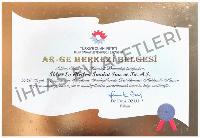 İhlas Ev Aletleri Ar-Ge Merkezi, Bilim Sanayi ve Teknoloji Bakanlığı tarafından Ar-Ge Merkezi olarak tescillendi.